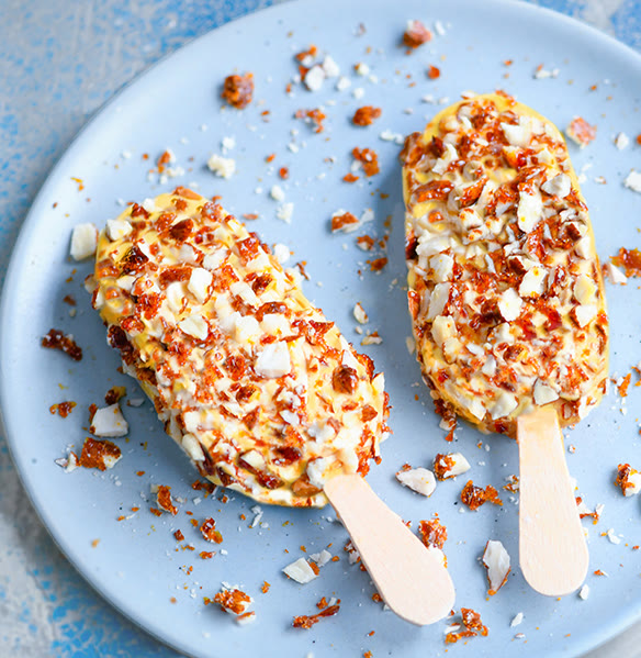 - Parta o crocante em pedaços e cubra os gelados.